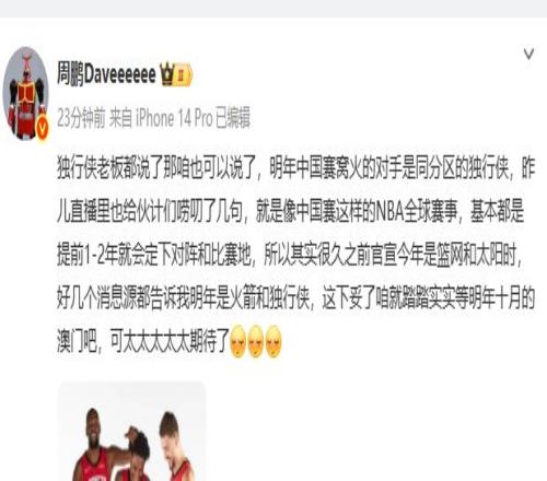 周鹏社媒:独行侠老板都说了那咱也可以说了,明年中国赛窝火的对手是同分区的独行侠,昨儿直播里也给伙计们唠叨了几句,就是像中国赛这样的NBA全球赛事,基本都是提前1-2年就会定下对阵和比赛地,所以其实很久之前官宣今年是篮网和太阳时,好几个消息源都告诉我明年是火箭和独行侠,这下妥了咱就踏踏实实等明年十月的澳门吧,可太太太太太期待了。