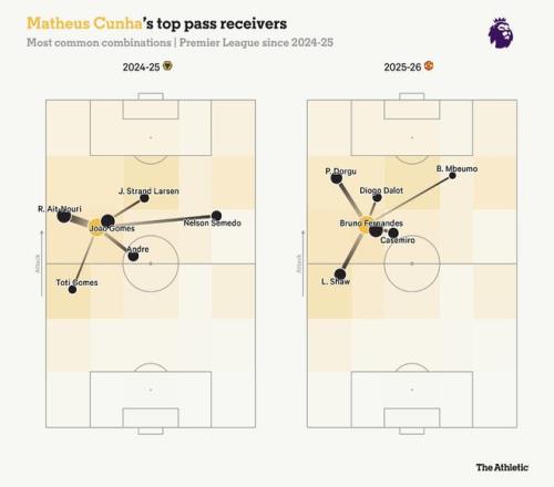 现在来说说更令人困惑的地方。库尼亚已经适应了老特拉福德,但曼联在适应他方面仍存在问题。库尼亚在传球选择上的习惯,与他上赛季在狼队时有着明显相似之处,但他与中锋之间的配合方式发生了变化。此前,库尼亚更习惯与一名长期驻守中路、牵制对方中卫、并能通过回做球帮助他前插的前锋合作。但在曼联,这种模式较难复制,因为伤病、疾病以及战术实验限制了谢什科的出场时间。