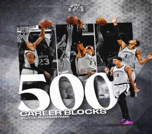 文班亚马此战送出了1次盖帽,其生涯总盖帽次数来到了500次。数据显示,文班亚马也是历史上第四快(143场)拿到500盖帽的球员,前三是马努特·波尔、大卫罗宾逊和马克伊顿。